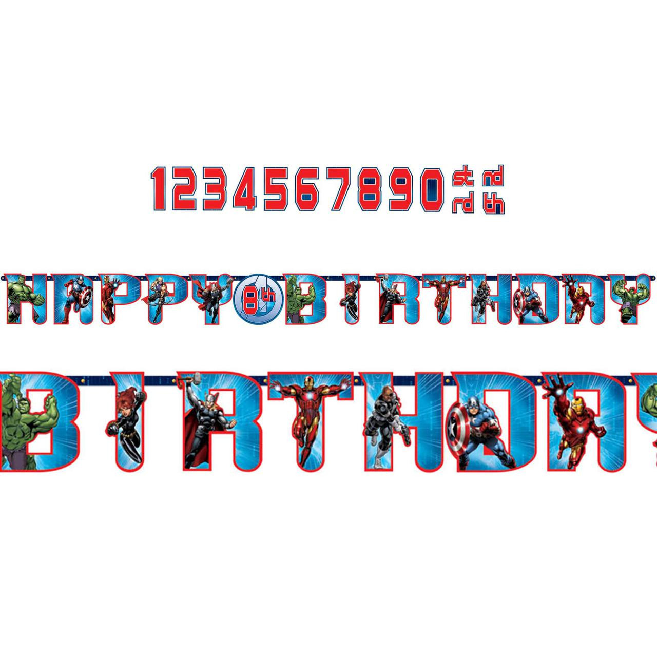 Say Happy Birthday in a big way with this Avengers Assemble Jumbo Letter Banner Kit! Includes a banner that measures 10' long. The kit includes 10" letters that spell "Happy Birthday" and cutout numbers to personalize with the birthday child's age. Double sided tape is also included.
