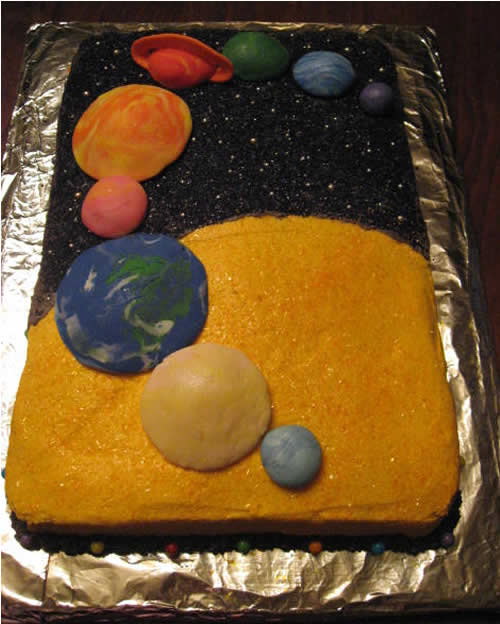 The cake is chocolate, iced in buttercream -- yellow on the bottom to make the sun; chocolate on the top. My daughter sprinkled black sprinkles on the chocolate buttercream to make the night sky. The sun is sprinkled with yellow and orange edible glitter. My daughter shaped the planets from fondant. (We bought the pre-colored kind like the kind found on this website -- a four-pack of primary colors, and a four-pack of the neon colors, plus also used some pink and white.) For some of the planets we marbled two or three colors together. My daughter rolled the fondant into balls, and then pressed them into the bottom of a half-circle to get a smooth, rounded finish. (For the smaller planets we used a half of a plastic craft Christmas ornament we had on hand; for the larger ones, she pressed the fondant into the base of a small bowl.) For some of the planets, we smoothed on a bit of luster dust to give the planets some shimmer. After placing the planets on top of the cake using a dab of buttercream icing, we placed silver dragee balls of three different sizes into the night sky to make "stars."