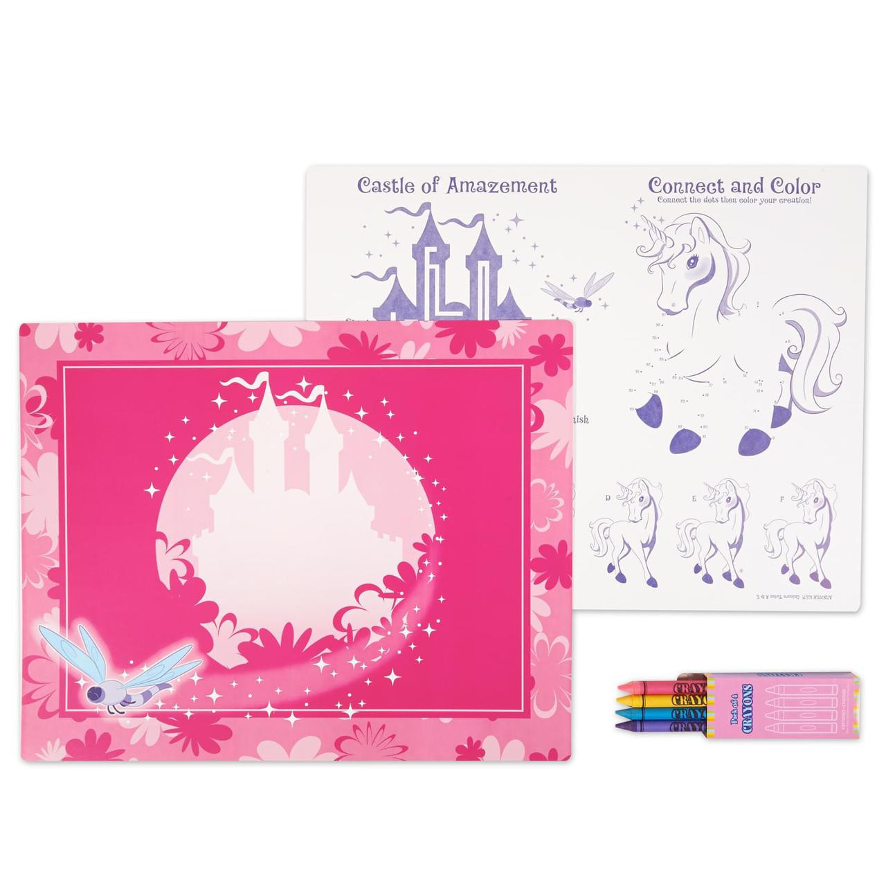 Celebrate her birthday and set your table with this Enchanted Unicorn Activity Placemat Kit for 4! The kit includes 4 paper placemats with fun games on the back and 4 boxes of crayons that each include 4 different crayons. The placemats each measure 11" x 14".