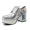 Heads will turn when you strut in the room. The Silver Pimp Shoes feature a 3" heel and lace-up top. Available in Adult Men's Sizes: Small (8-9), Medium (10-11), and Large (12-13). Shoes that show obvious wear or are missing the original packaging are not returnable.