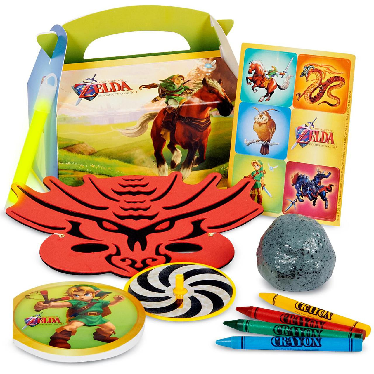 This Favor Box for one guest includes one The Legend of Zelda sticker sheet*, plus an assorted laser spin top, assorted dragon mask, Splat Rock, an assorted glow light stick plus a Zelda Notepad and 4 primary crayons. Adult Assembly Required. One or more of the party favors included in this favor kit may be substituted with an item of similar quality due to availability. This is an officially licensed The Legend of Zelda product.